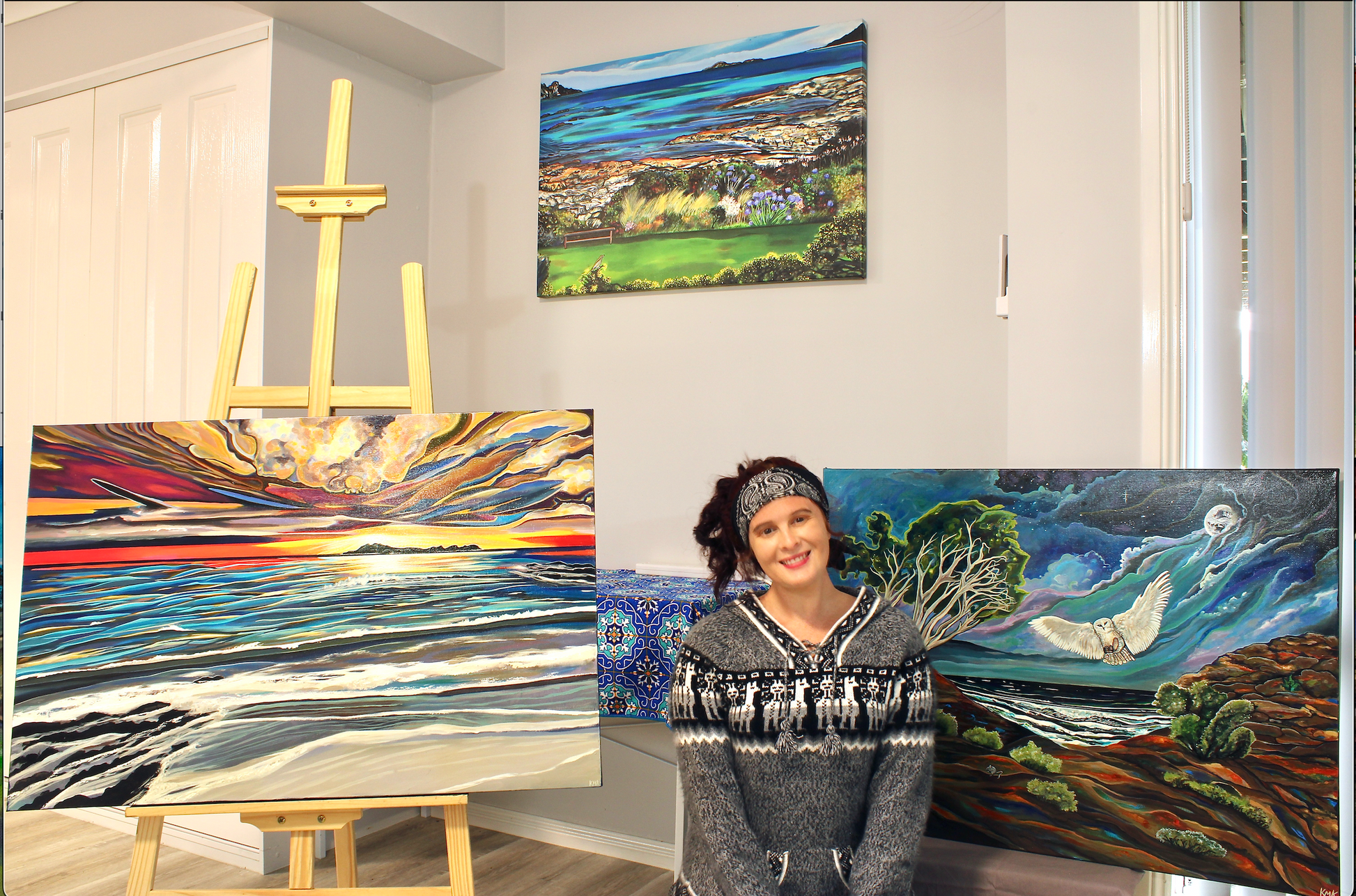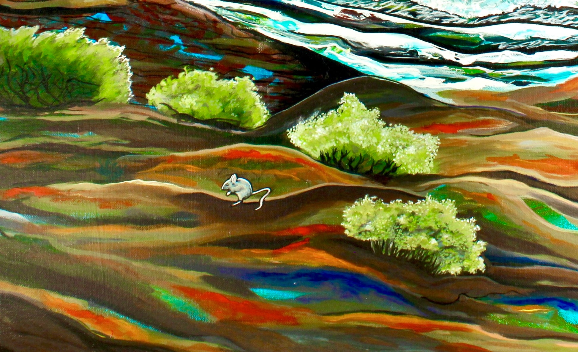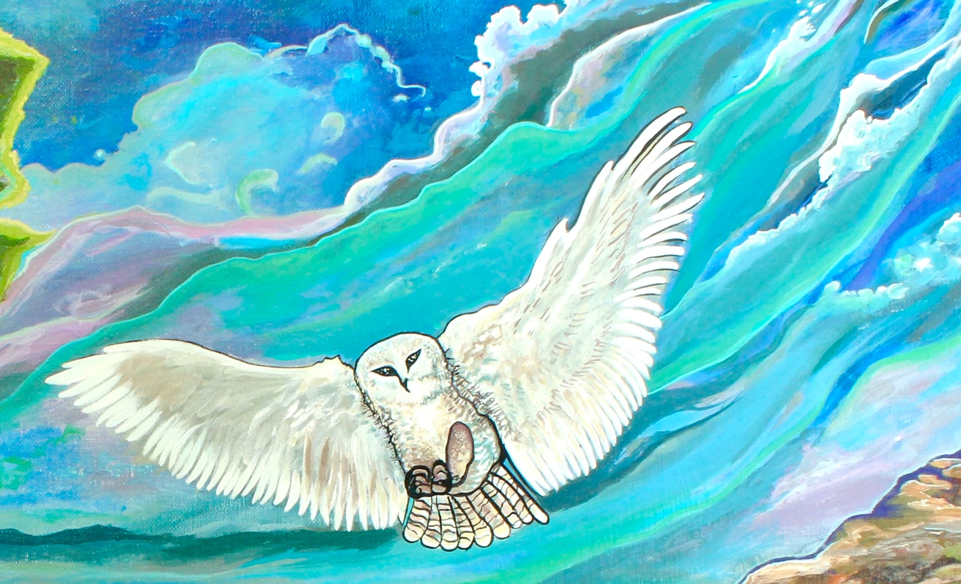 The Snowy owl, known for its stunning white plumage, is found in various regions including Europe, Asia, North America, and the Arctic. I have always been captivated by the elegance of these majestic birds. Inspired by their beauty, I painted a scene where a Snowy owl is depicted in hot pursuit of an Australian-Native Hopping mouse amidst an Australian-inspired landscape. The setting showcases red-orange rocks and untamed bush, which adds to the rugged charm of the scenery. To enhance the enchantment of the piece, I incorporated one of my signature starry night skies. Owls possess an undeniable air of magic, mystery, and allure, making them truly captivating creatures to portray through art.